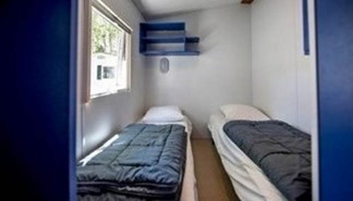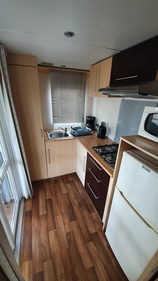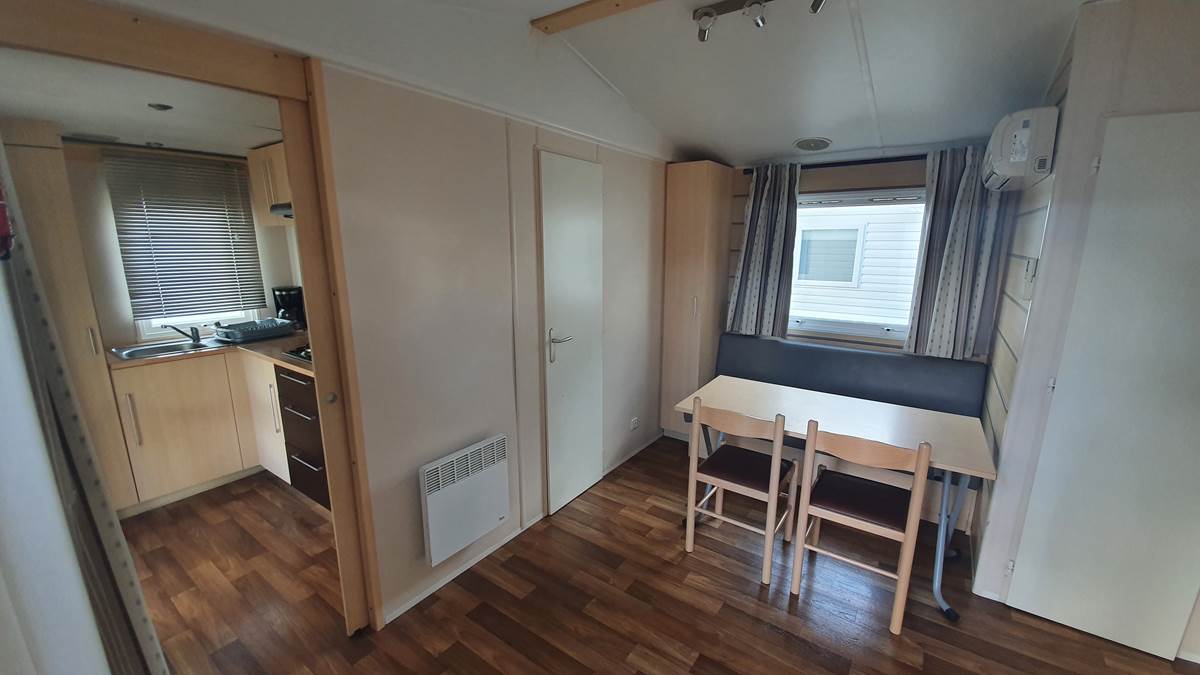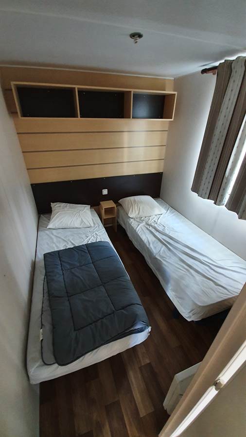 Nos mobil homes deux chambres, confortables et spacieux pour 4 personnes sont composés d'une chambre avec un lit double 140 x 190, une chambre avec deux lits simples 80 x 190, une kitchenette équipée, un coin salon, une salle de bain avec une douche et un lavabo. Les WC sont séparés.